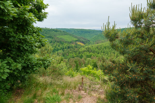 From the parking lot, you first walk to the Jardin des Poètes, a spot on the Altenbourg estate that was created in 2000 at the initiative of the municipality. Wooden panels with poems by René Char, Goethe, and Louise Weiss are scattered along the paths. You then continue through a mixed forest to the first rock formation, Rabenfels, or Rocher du Corbeau. From the rock, you have a beautiful view of the surrounding area. You descend again along a forest path, reaching a paved road. Follow this road for a while, then pass Le Petit Étang, a fishpond. The path then climbs again and leads you to the impressive Rocher des Païens. This rock may derive its name from the Druidic rituals that were said to have taken place there. You continue through a beautiful forest, where you can also visit the Grand Chêne, before finally reaching the third rock, the Rocher Blanc. Here, you'll find a beautiful view of La Petite Pierre and the castle. A steep descent takes you back to the village and the starting point.