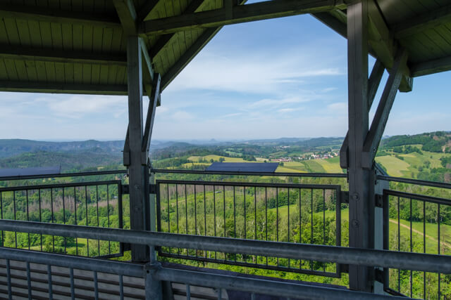 The special charm of the view from the Weifberg Tower lies in the alternation between the rock formations of the Elbe Sandstone Mountains in front of the ridge of the eastern Ore Mountains and the conical mountains of the Bohemian Middle Mountains and the Kreibitzer Mountains. The Czorneboh greets you from the Lusatia Mountains in the north, the water tower in the northeast, the Bismarkturm near Neugersdorf and the Lausche in the east. Behind it, between the Wolfsbergspitze and the Lausche, we can see the Jizera Mountains and the Giant Mountains in the east with good visibility. To the right of the Lausche you can even see the Jeschken transmission tower. In the southeast lie the Kreibitzer Mountains, dominated by the Tannenberg and Kaltenberg. The mighty Rosenberg appears in the south.