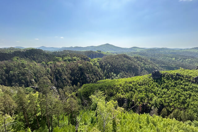 Een prachtige wandeling in Boheems Zwitserland die je naar drie uitzichtpunten Marienfelsen, Wilhelminenwand en Rudolfstein brengt. Verder gaat de route door het Purkartickýbos naar de ruïnes van rotskasteel Falkenstein.
